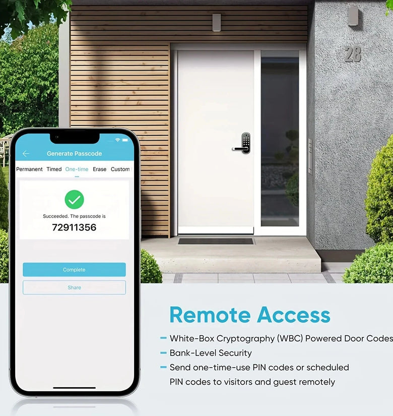 1.Advanced Security: Our smart fingerprint door lock features bank-level security and White-Box Cryptography (WBC) for robust code encryption. Whether you need to generate one-time-use or long-term codes for visitors or guests, this lock ensures secure access remotely.