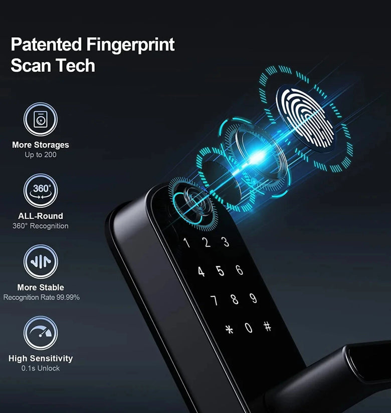 3.Fast & Reliable Fingerprint Recognition: Unlock your door in under 0.1 seconds with our sophisticated fingerprint recognition technology. With 360° recognition and a 99.99% accuracy rate, our lock offers high sensitivity and stable performance.