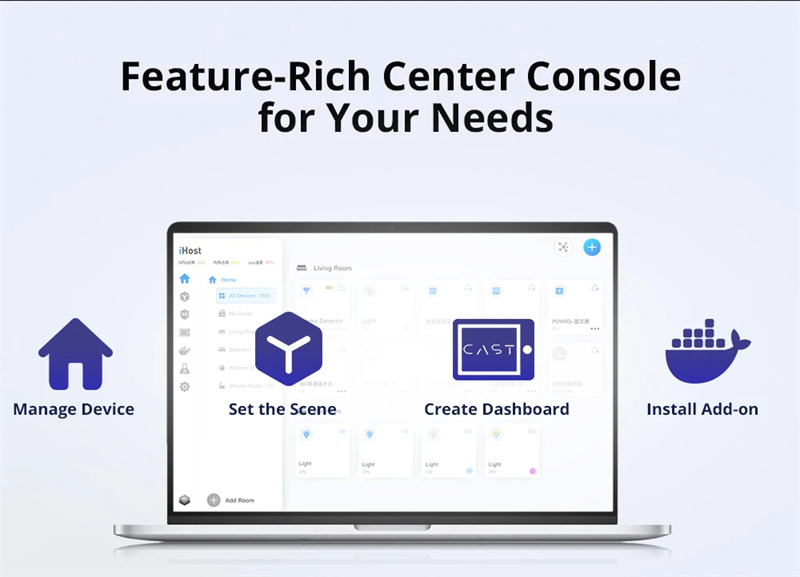 6. Feature-Rich Dashboard Console: Supports device management, scene setting, add-on installations, and customizable dashboards for streamlined operation.