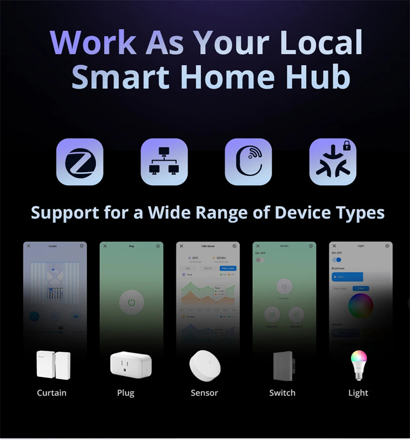 1. Wide Device Compatibility: Supports a variety of smart devices including curtains, plugs, sensors, switches, and lights.