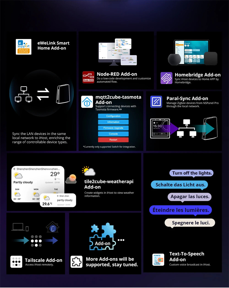 4. Open API & Add-on Integration: Allows integration with third-party platforms and supports open-source add-ons like Node-RED, Homebridge, and Tasmota.