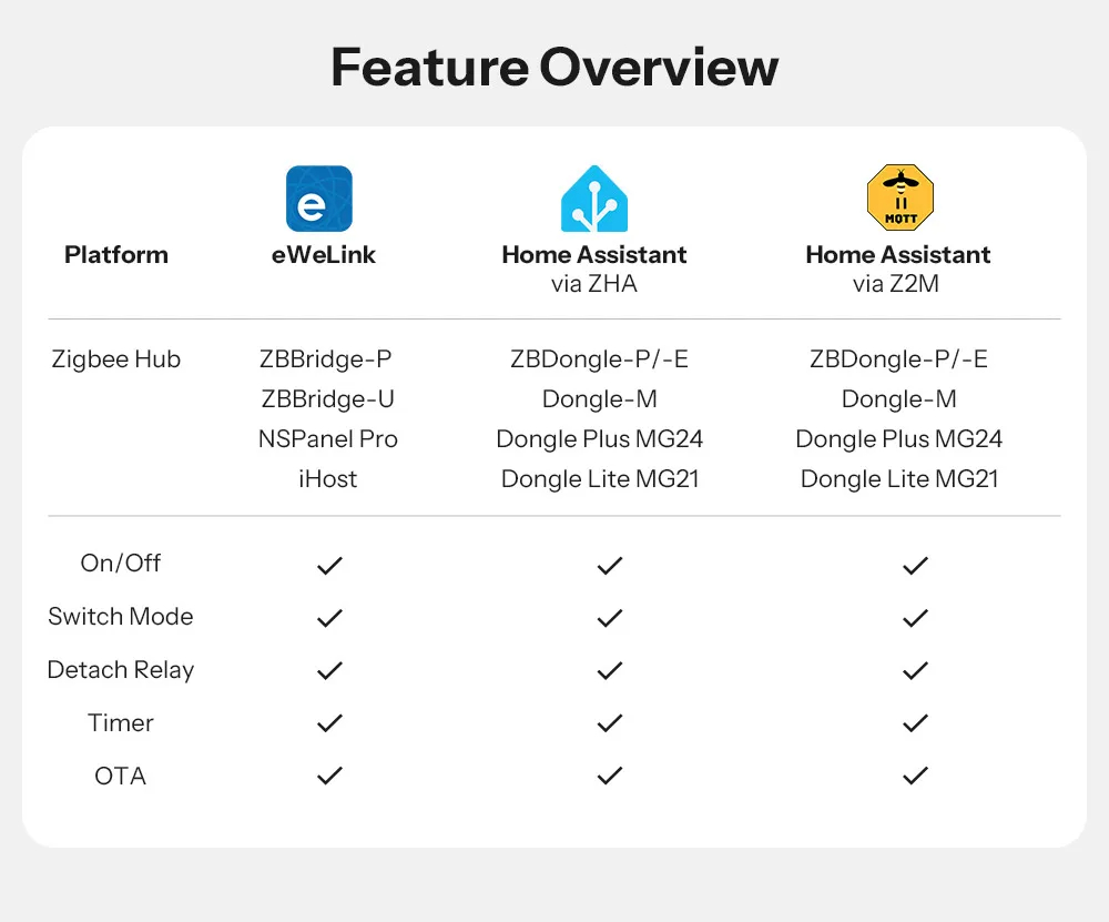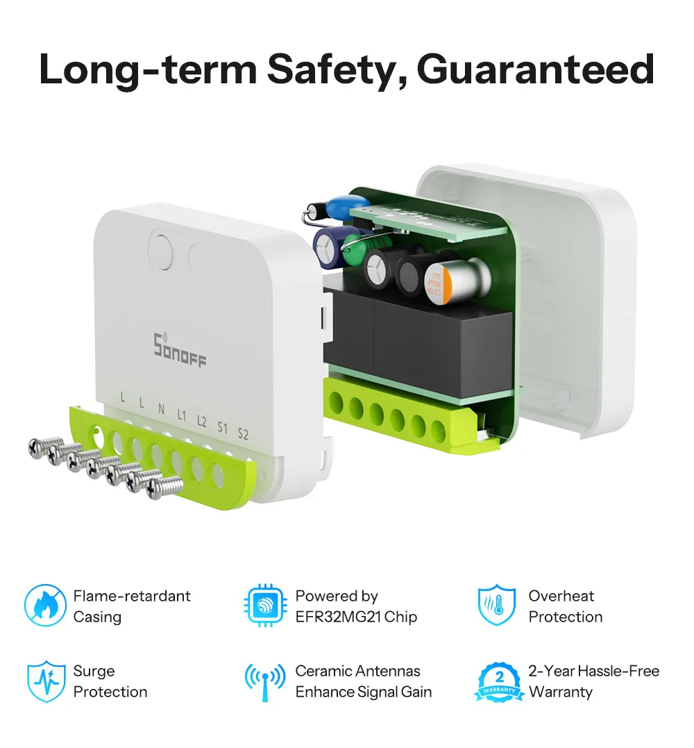 6. Safety Features: Flame-retardant body, EFR32MG21 chip, surge protection, and overheat protection ensure reliable functionality.