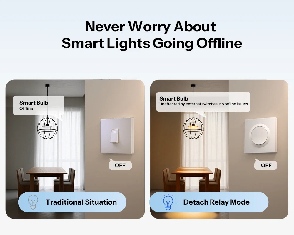 3. Relay Detach Mode: Prevents offline issues with smart bulbs.