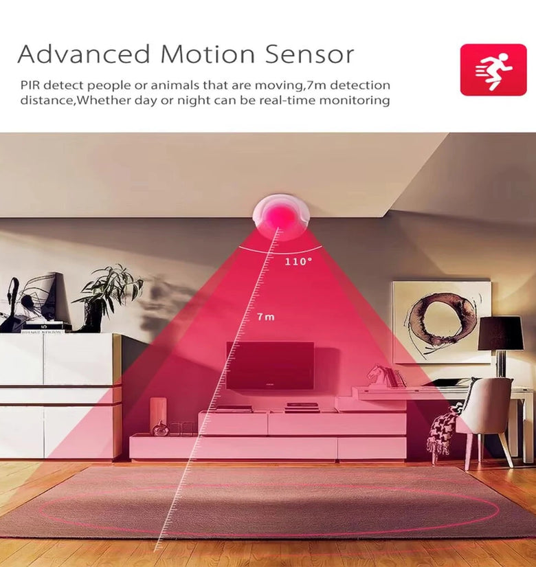 2. Advanced Motion Detection: Benefits from precise and remote motion detection with a range of up to 7 meters and a sensitivity angle of 110°, enhancing home security.