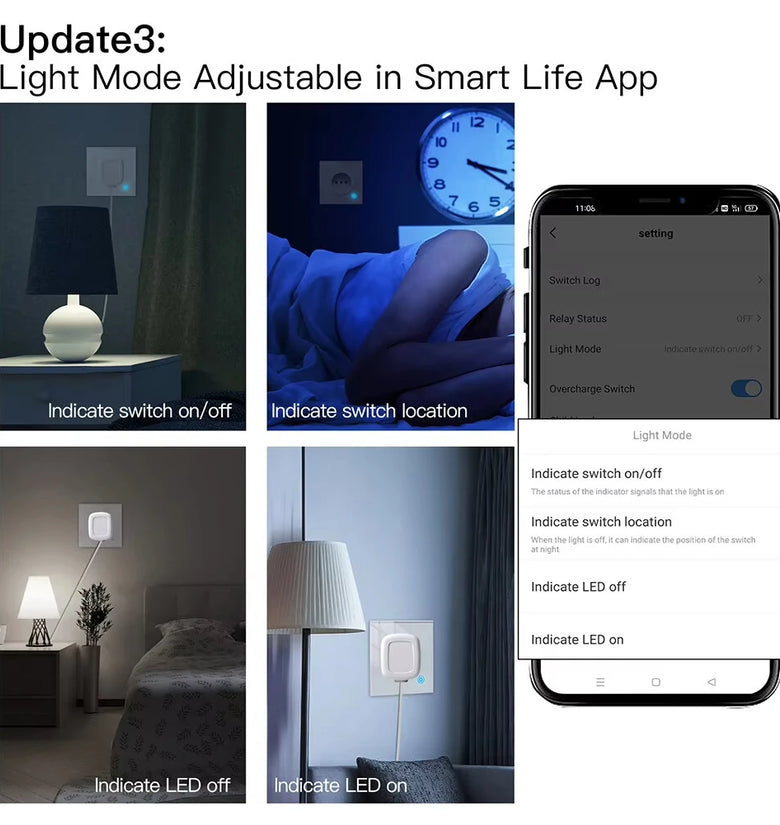 3. Configurable Relay Status and Light Mode: Customize the relay status with ON/OFF/Remember last status options, and adjust the light mode for added convenience. Includes overcharging switch and child lock features for enhanced safety.