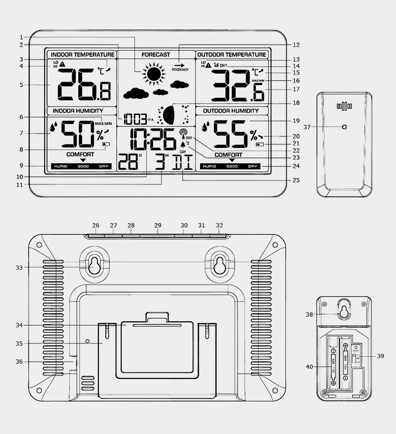 • Wireless Weather Station Indoor Outdoor Thermometer Hygrometer with Forecast Moon Phase Barometer Alarm 7 Buttons Backlight RF Sensor Large LCD Display