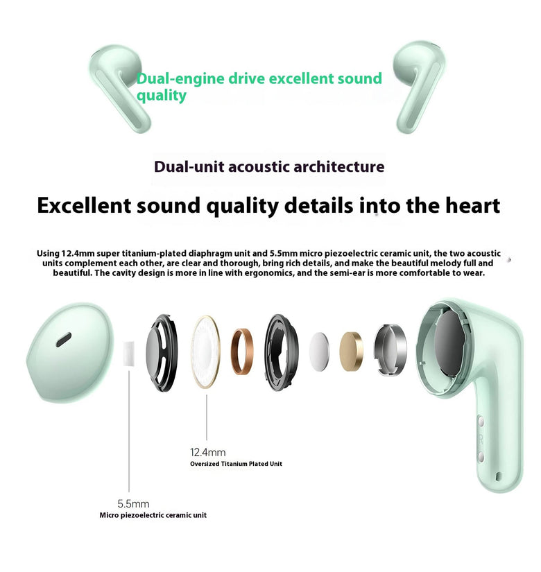 2. Superb Sound Quality: Features a dual-unit acoustic architecture, integrating a 12.4mm large titanium-plated diaphragm unit alongside a 5.5mm micro piezoelectric ceramic unit, delivering clear and rich sound.