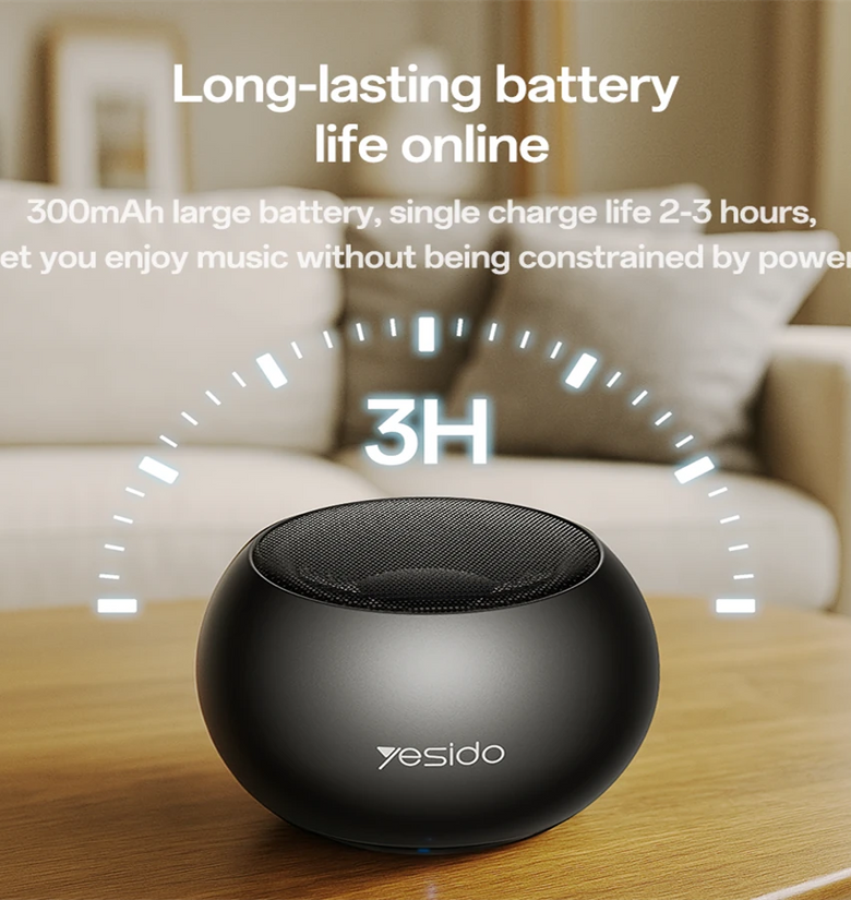 Powered by a 300mAh large battery, this speaker offers hours of continuous playback, ensuring long-lasting enjoyment without interruptions.