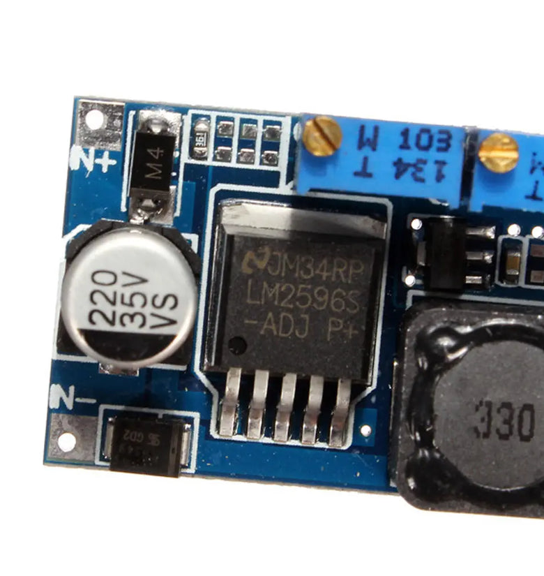 This module is an adjustable buck module, the module can be adjusted from the blue adjustable resistor to change the output voltage. Input and output differential pressure is 2V, the minimum can be output 1.23V.
