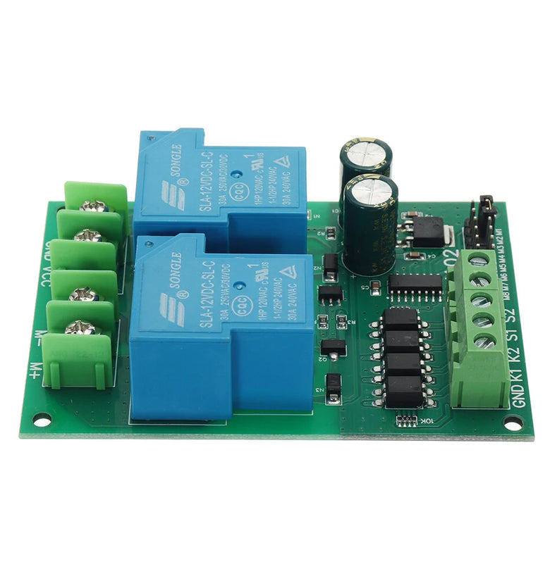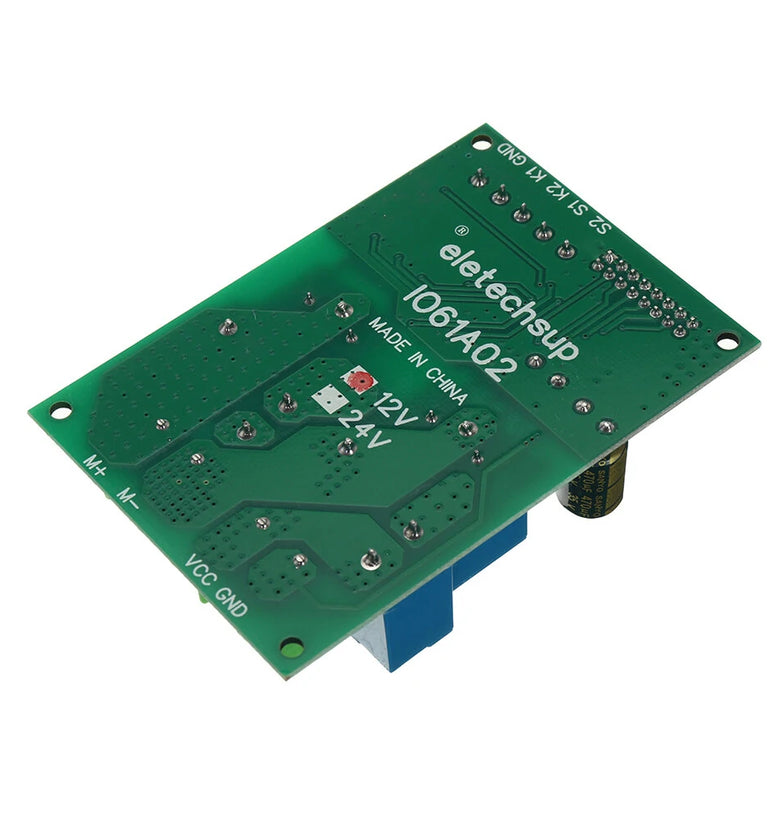 This module has 4 signal input terminals, namely ''K1'', ''K2'', ''S1'', ''S2'', K1 is the forward rotation signal input terminal, K2 is the reverse rotation signal input terminal, and S2 is the forward rotation limit signal Input terminal, S2 is the reverse limit signal input terminal. The signal input source can be selected from micro switch, induction, infrared, metal, remote control and other modules, and can also be controlled by a single-chip microcomputer.