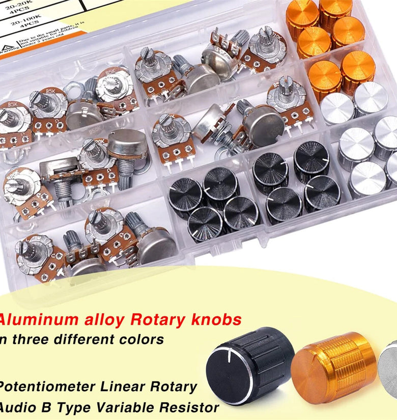 1. Versatile Resistance Options: This assortment includes potentiometers with a wide range of resistance values (5K, 10K, 20K, 50K, 100K ohms), catering to various electrical and electronic requirements. Ideal for audio control, signal level adjustments, and other applications requiring precise electronic adjustments.