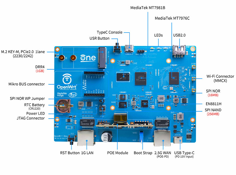 1. The 'OpenWrt One/AP-24.XY' router board based on MediaTek MT7981B (Filogic 820) SoC and MediaTek MT7976C dual-band WiFi 6 chipset.It is the first official development board of the OpenWRT open source community