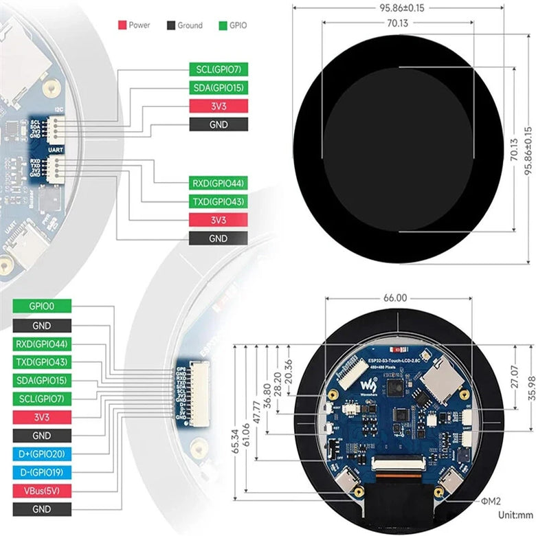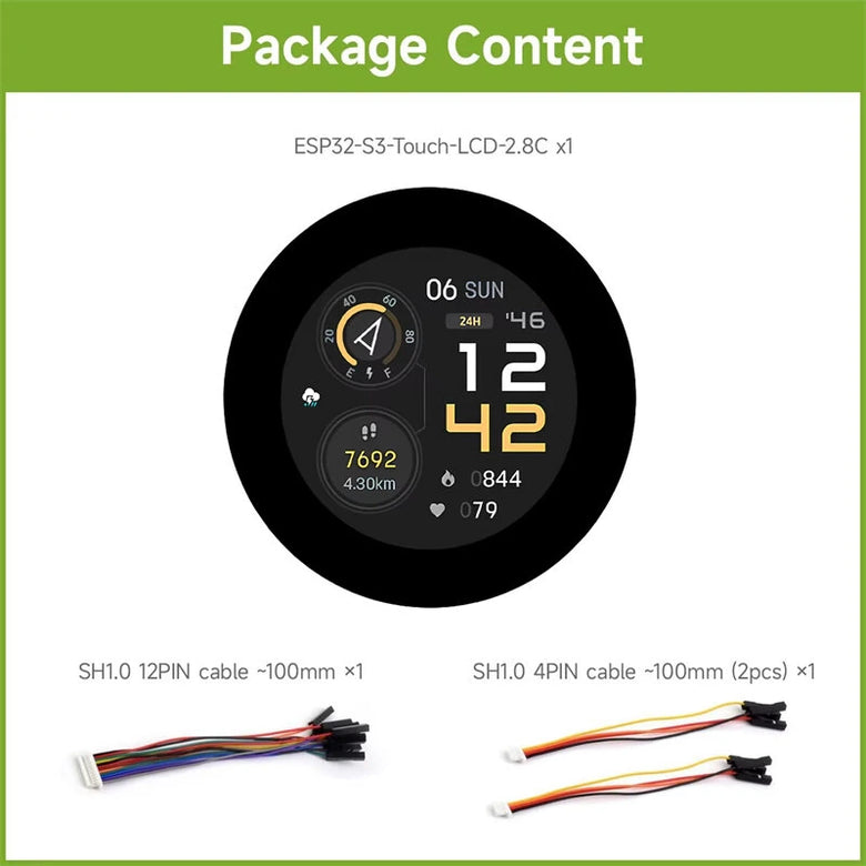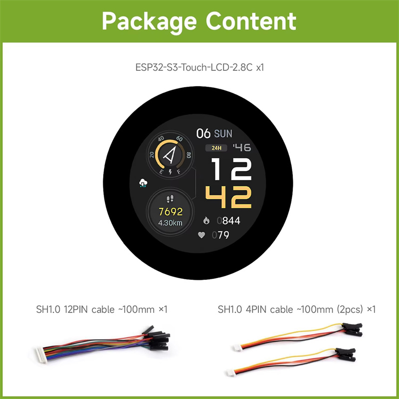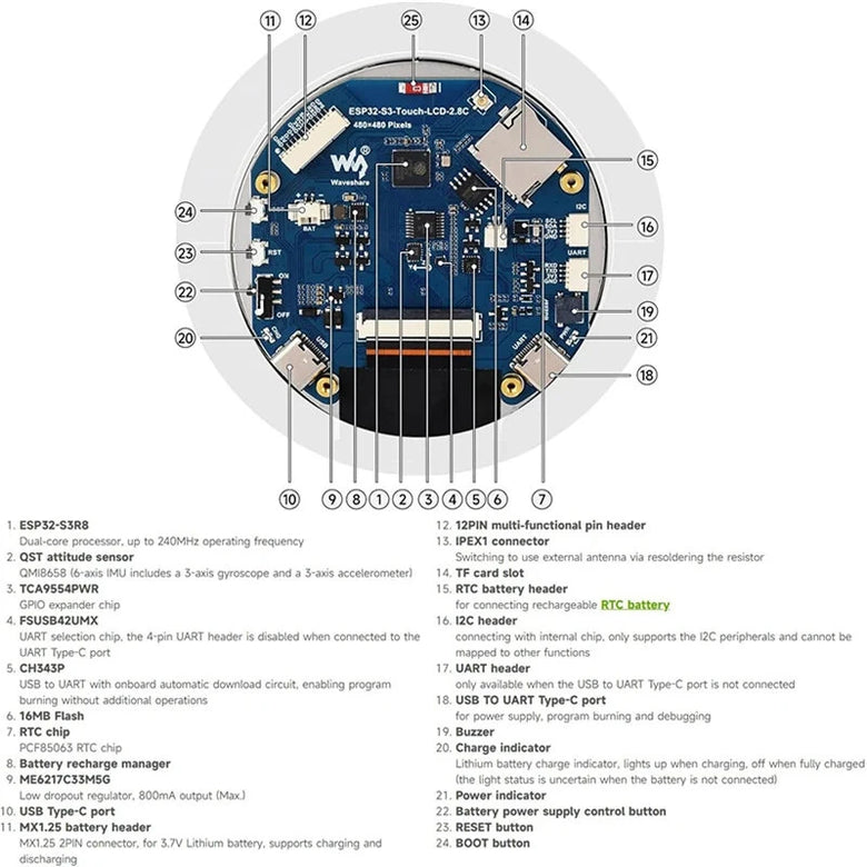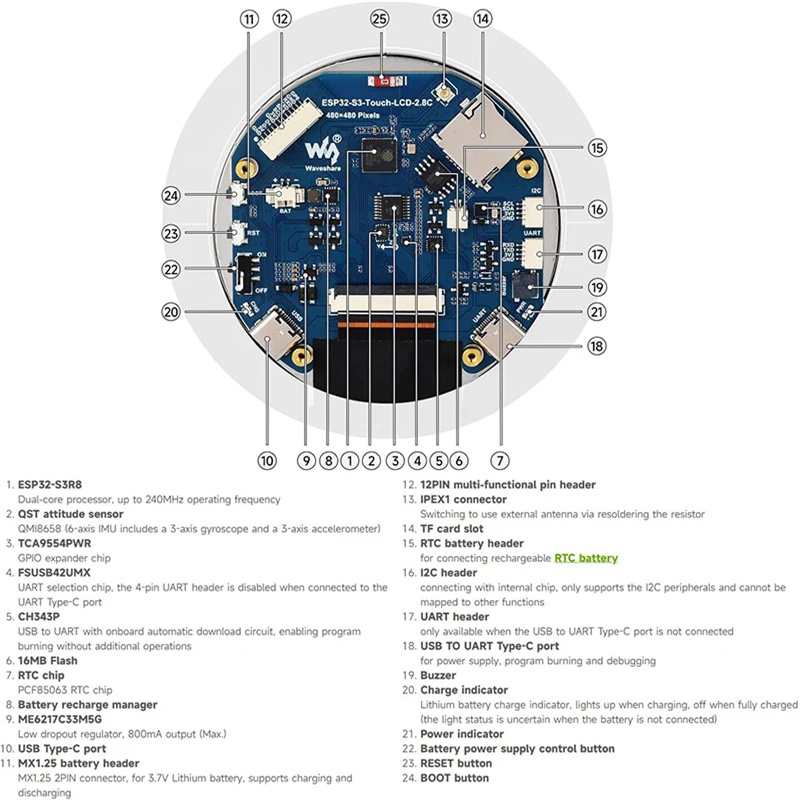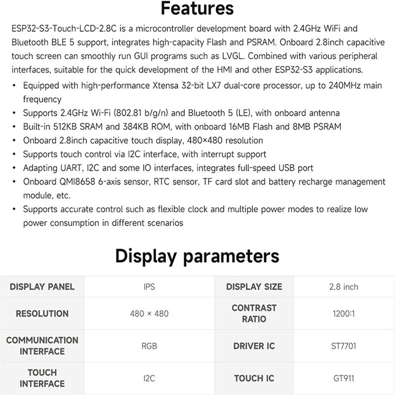 • ESP32-S3 2.8 inch IPS Touchscreen LCD Development Board Dual-Core Processor Wi-Fi Bluetooth BLE 5 I2C Interface 480x480 Resolution