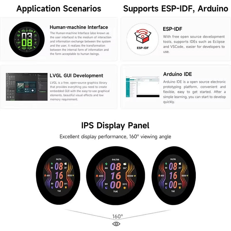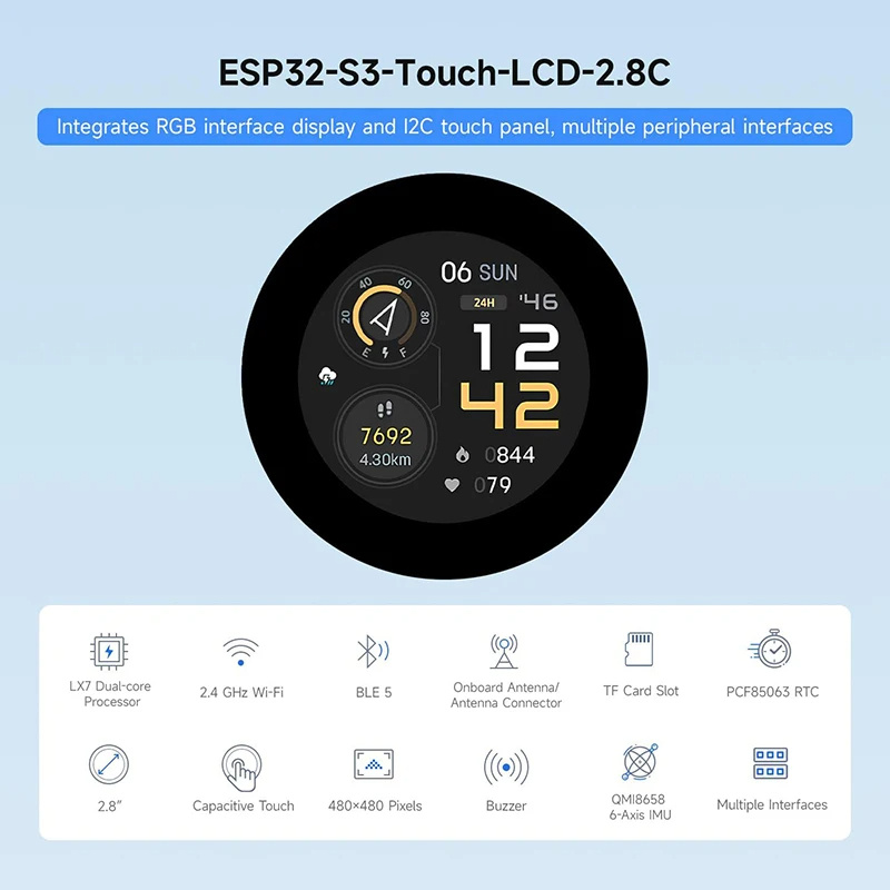 - The round 2.8-inch capacitive touchscreen features a high resolution of 480 x 480 pixels, offering sharp and vibrant visuals, ideal for modern GUI applications.
