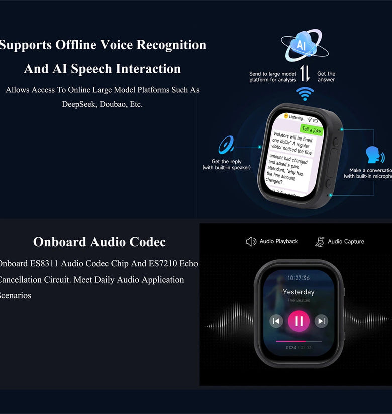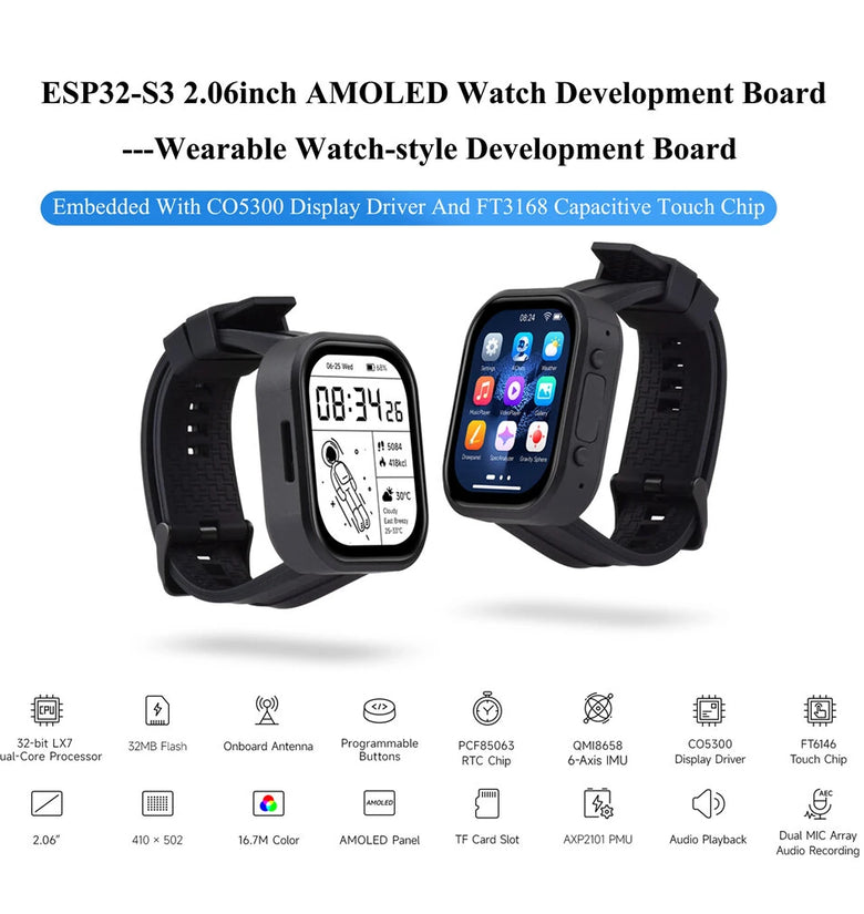 Includes QMI8658 six-axis motion sensor and RTC clock chip for detailed tracking of motion, positioning, and timing in real-time applications.