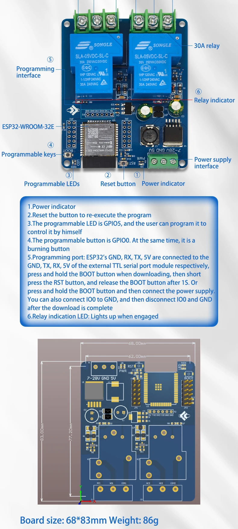 2. Dual 30A relays designed for controlling high-power loads up to AC 250V or DC 30V.