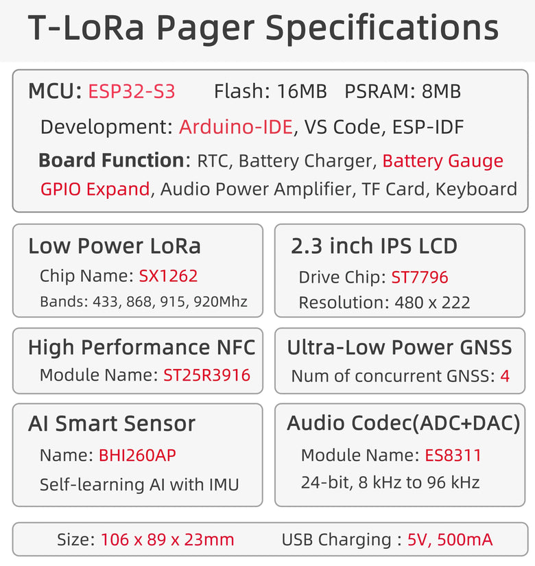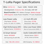 T-LoraPager Introduction:Next-generation programmable handheld AIoT device from LILYGO, combining ESP32-S3 with selectable wireless modules. Features a compact form factor with foldable external antenna, delivering optimal RF performance without compromising aesthetics.Preloaded with LILYGO's interactive demo system showcasing rotary encoder navigation. Open SDK supports custom development for industrial IoT, asset tracking, smart agriculture, and more scenarios.