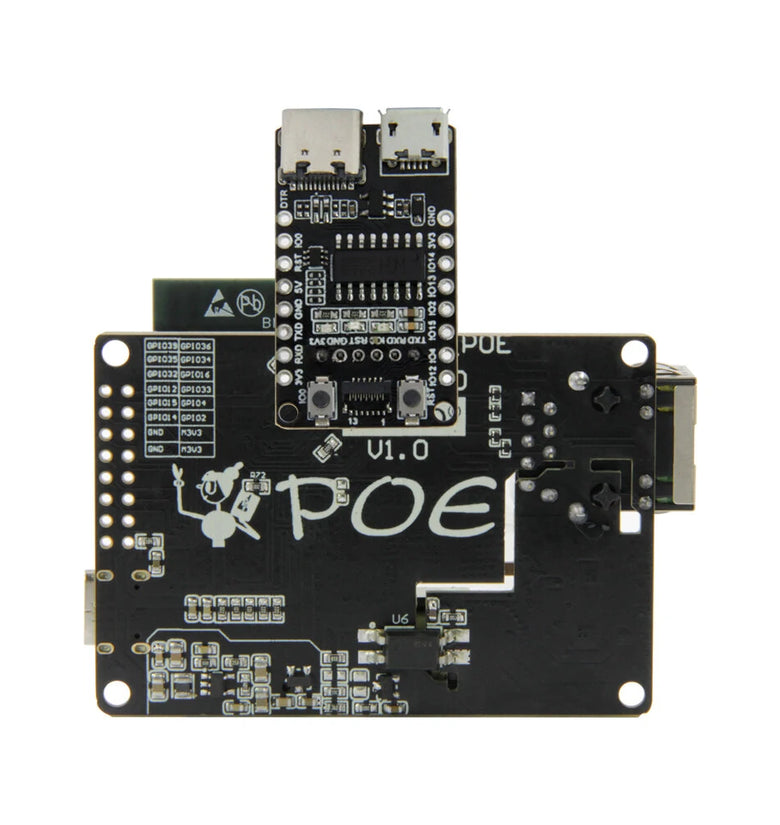 T-Internet-POE Compatible with PoE mode A (powered by data pair) and PoE mode B (powered by backup pair), and auto MDIX, allowing the use of straight and crossover Ethernet cables.Compatible with 4 mounting holes for regular M2.5 or 4-40 screws.When purchasing multiple T-Internet-POE modules, you only need one Download Board. The Download Board can be connected using pins without the need for soldering, making it more convenient to use.T-POE-Pro Introduction: