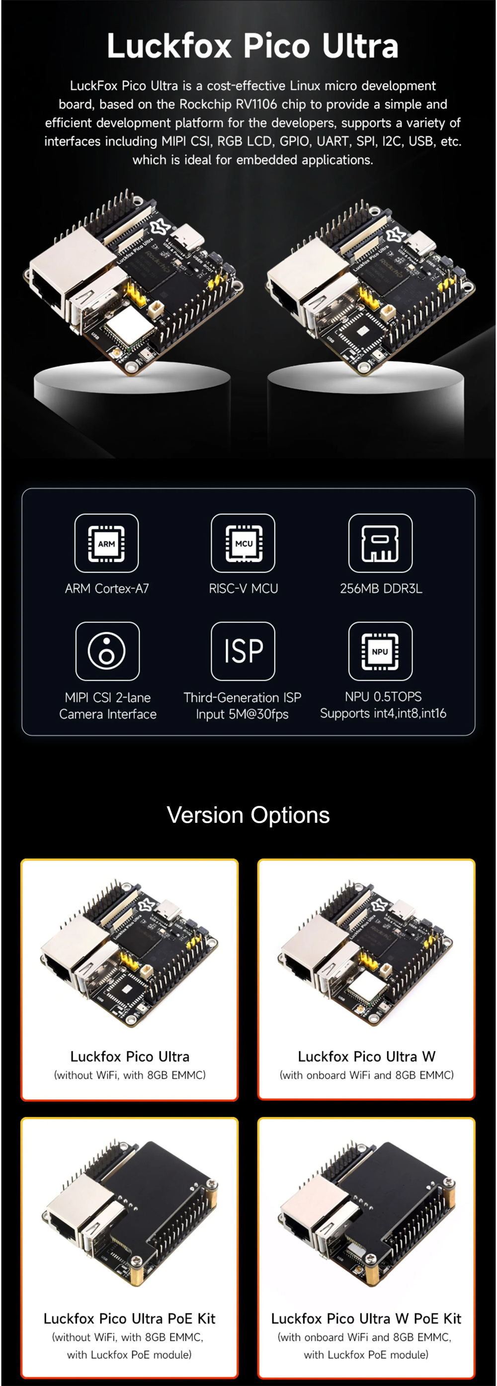 1.High-Performance Integrated Processor: The Luckfox Pico Ultra is equipped with a powerful ARM Cortex-A7 32-bit core, integrated with NEON and FPU capabilities. This combination ensures it delivers excellent computational performance, essential for handling complex tasks in embedded applications efficiently.