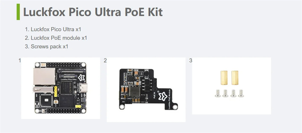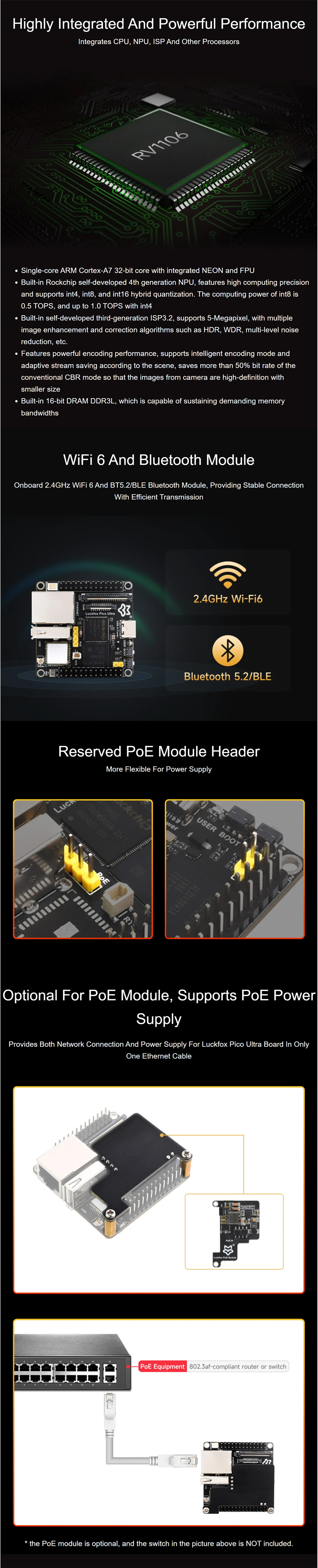 5.Optional Power over Ethernet (PoE) Support: The Luckfox Pico Ultra offers an optional PoE module, which simplifies power and data delivery through a single Ethernet cable. This feature reduces cabling complexity and ensures a more streamlined deployment, making it highly suitable for networked environments.