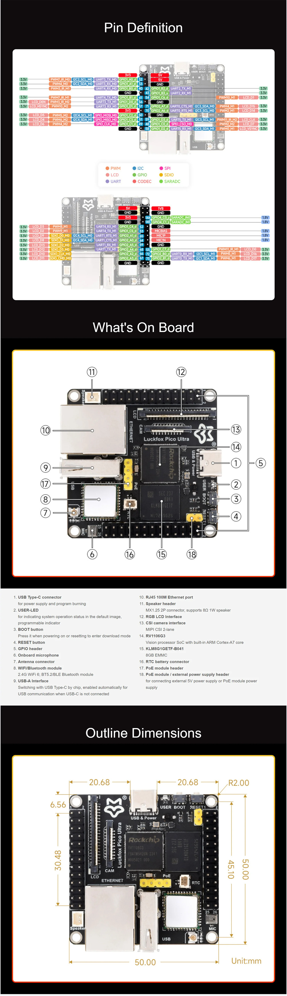 4.Efficient Wireless Communication: With built-in WiFi 6 and Bluetooth 5.2/BLE modules, the Luckfox Pico Ultra provides robust and reliable wireless communication. This combination allows for fast data transmission and seamless connectivity, enhancing the development and deployment of IoT and embedded solution.