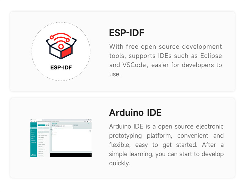 4. In terms of software, you can choose ESP-IDF development environment or Arduino IED for development, so you can get started easily and quickly and apply it to products.