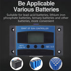 This solar controller is designed to be compatible with multiple types of batteries, including lead-acid, lithium iron phosphate, and ternary batteries. This wide range of compatibility enables you to utilize the device across various energy storage systems, ensuring unparalleled versatility.