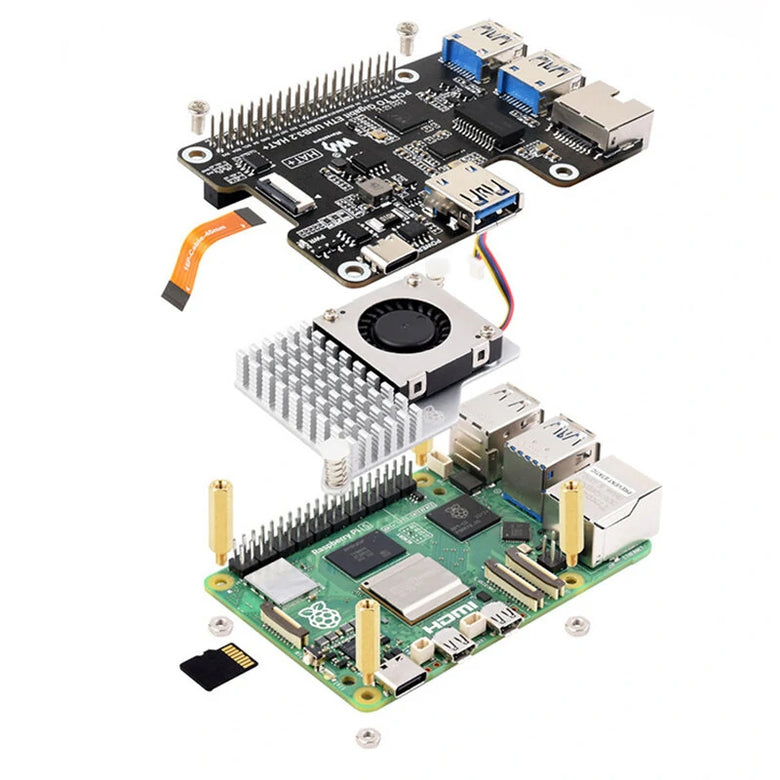 PCIe TO Gigabit ETH and USB 3.2 Gen1 for Raspberry Pi 5, onboard 3 x USB connectors, driver-free, plug-and-play, 3 x high-speed USB ports, Gigabit ETH port, HAT+ standard.