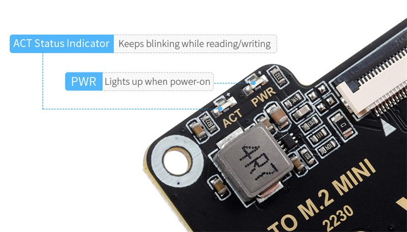 5. Onboard working indicator lights, with PWR on continuously when powered, and ACT blinking during read/write.