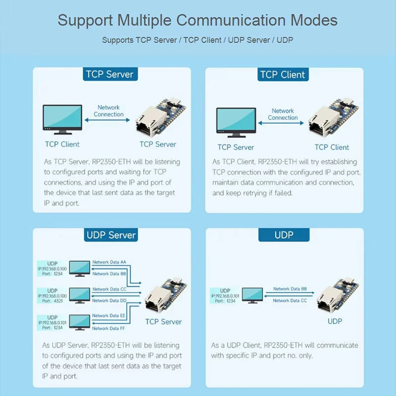 • Onboard CH9120 with integrated TCP/IP protocol stack