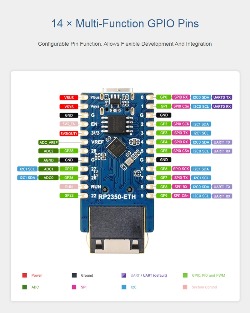 • 14 × multi-function GPIO pins, compatible with some Pico HATs