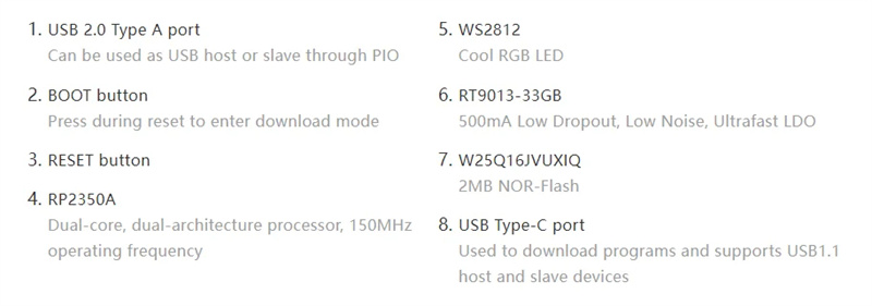 2. The unique dual-core and dual-architecture is equipped with a dual-core ARM Cortex-M33 processor and a dual-core Hazard 3 RISC-V processor, with a clock running frequency of up to 150MHz.