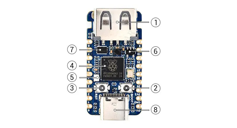 1. It uses the RP2350A microcontroller chip designed by Raspberry Pi.