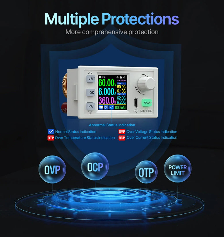 RK6006 supports firmware upgrade, so that new functions can be added, and the product will be more powerfulMore convenient, PC, mobile phone, APP control multiple operation1.54-inch LCD display screen, larger screen, 240*240P higher display resolutionHigher Range, voltage/current higher output. Output voltage 060.00V, output current 0-6.000A, 4-digit display360°Rotating Screen. Maintain the best viewing angle at all times, meet any angle to read measurement data