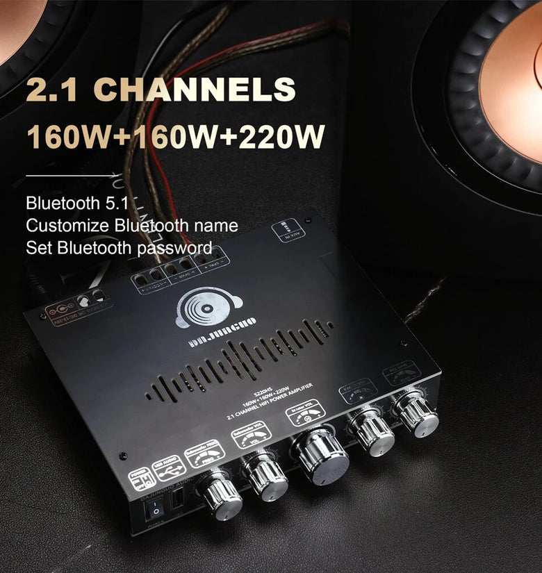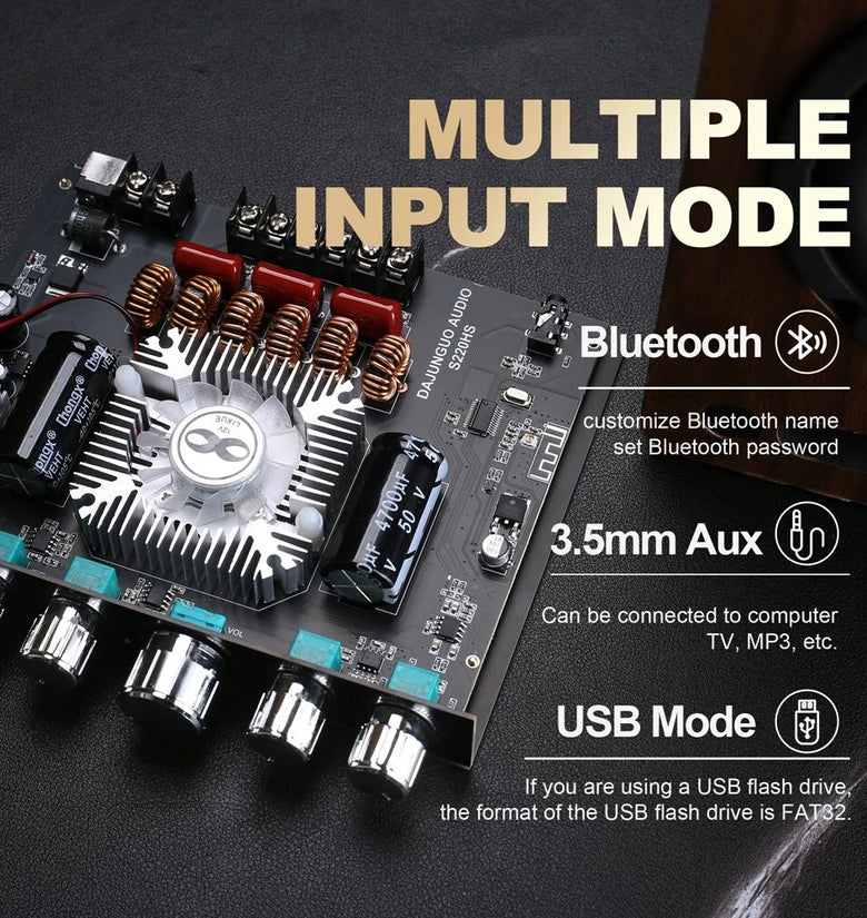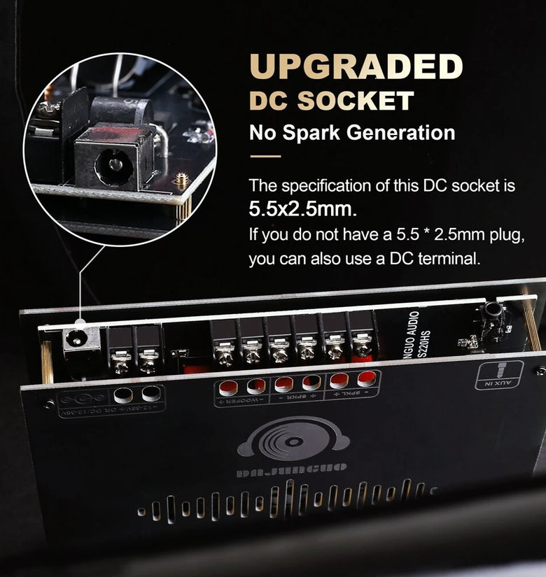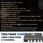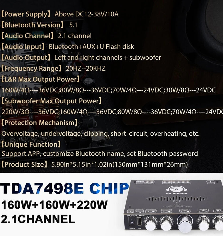 Feature:TPA7498E HIFI chip solution: Stereo dual-channel output ensures continuous serial high-power operation, THD ≤0.1%. Wide voltage input DC: 12-24V;Treble and Bass Control: If you are tired of the inherent high and low bass, why not try the high and low control knobs! This will make you feel like you are in a movie theater. ;Bluetooth and AUX function: Bluetooth 5.0 version, longer transmission distance. In an open environment, the transmission distance can reach 49 feet. If your playback device doesn't have Bluetooth, you can also input audio signals via a 3.5mm headphone plug. ;Safety protection: This amplifier board has overheating protection, reverse protection, circuit protection, overvoltage and undervoltage protection;Colour:blackMaterial:plasticPackage includes: