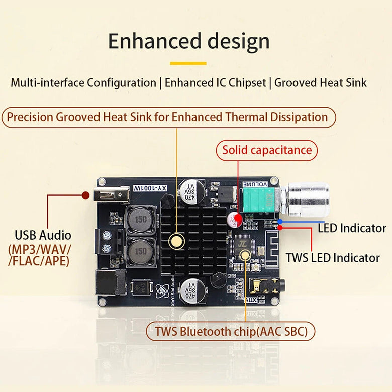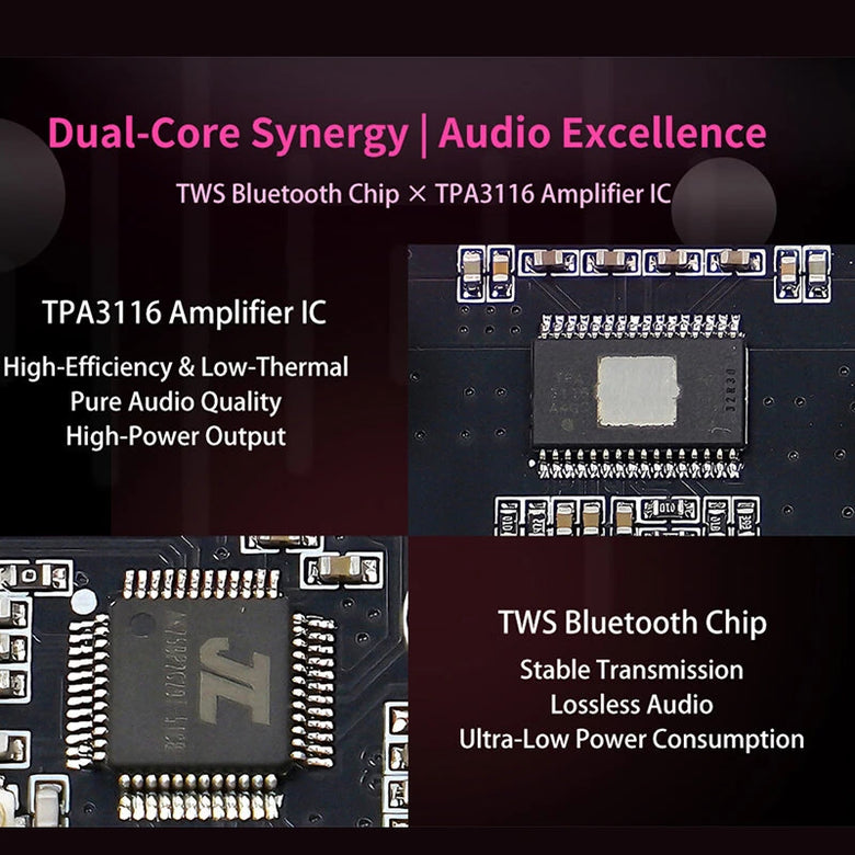 4. IC Chip Enhancements: Equipped with a TPA3116D2 amplifier chip and TWS bluetooth chip for excellent audio quality and efficiency.