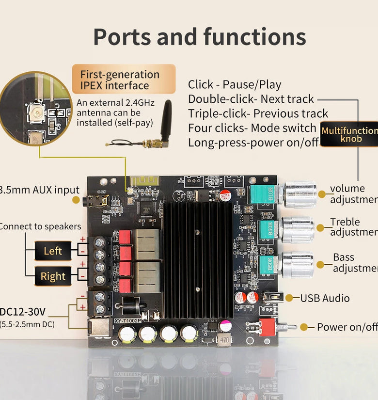 3. Versatile Audio Inputs: Featuring Bluetooth, AUX, and USB inputs, this amplifier board supports various audio sources for maximum versatility.
