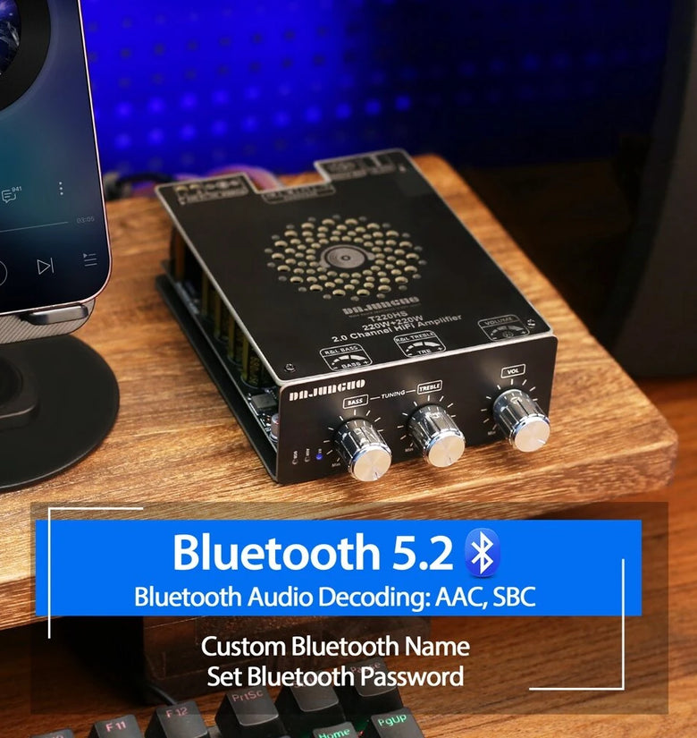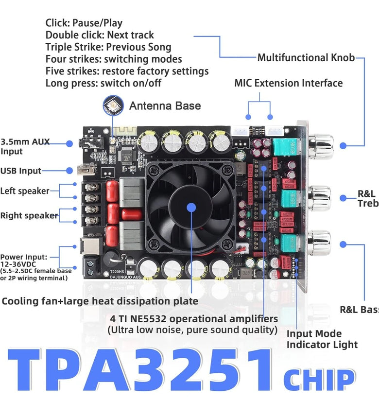 Feature:1. High power output: Using the imported TPA3251D2 chip, the output power can be as high as 220W+220W.TPA3251D2 is a high-performance Class D power amplifier with Class D efficiency and can bring true high-end sound quality. The device features advanced integrated feedback design and proprietary high-speed gate driver error correction function. This technology allows the device to maintain ultra-low distortion throughout the entire audio band while showing perfect sound quality.