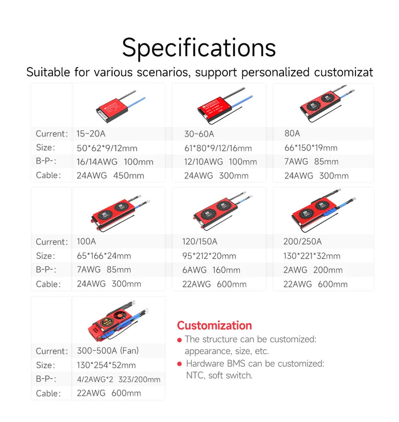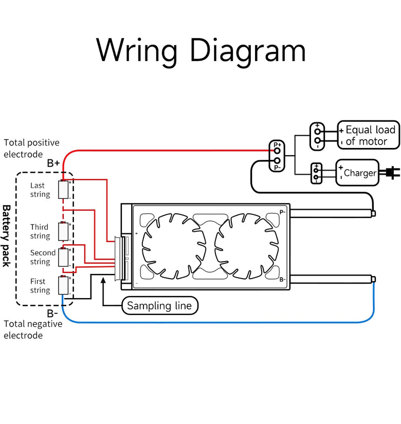 Protective board connection battery wiring:* Special attention: The wire cable of different manufacturers are not same standard, please make sure to use he matching cables; the colors of B- and P- lines of different manufacturers are different, please pay attention to the B- and P- marks.1. Remember!!! When welding sampling wire cable, do not insert the cable into the BMS.2. The cable connects the total negative electrode B-from the fine black line. The second wire (red wire) is connected to the positive pole of the first string of batteries.Connect the positive electrode of each string of batteries in turn until the last wire cable of the total positive B+.3. After the cable is connected, do not insert the plug directly into the BMS.First measure the voltage between each two adjacent metal terminals on the back of the plug. If it is a ternary lithium battery, the voltage should be between 3.0~4.15V, and the iron-lithium battery should be 2.5~ Between 3.6V, lithium titanate battery should be between 1.8-2.8V, make sure the voltage is correct before proceeding to the next step.4. Receive the BMS B-line (blue thick line) to the total battery negative electro-de (B-line length should not exceed 40cm).5. Insert the wire cable into the BMS.After the wiring is completed:1. Measure whether the voltage of battery B+, B- is equal to the voltage of B+ and P- (that is, whether the voltage of the battery pack itself is e- qual to the voltage after passing through the protection board, if they are equal, the BMS is working normally, which can be used normally. If not, please follow Re-check the queue of the wiring above.2. The positive electrodes of the charging and discharging end are all directly connected to the total positive pole B+ of the battery; the wiring method of the same port BMS is that the charging and discharging negative poles are connected to the P- point of the BMS; the wiring m- ethod of the branch BMS is the negative pole of charging Connected to C-, the negative electrode of discharge is connected to P-.3. Finally, if you have any questions, please contact the customer service to help you solve it.