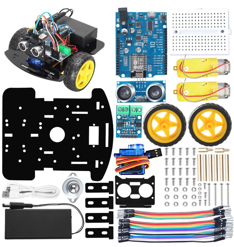 ESP8266 Development Board *1L9110S motor drive plate *1HC-SR04 ultrasonic module *1Ultrasonic sensor bracket *118650 battery box(without battery for shipping) *1DC TT motor *2Breadboard 170 *1SG90 servo motor *1Data cable *110cm male to female Dupont line *1610cm male to male Dupont line *8Mini DIY car chassis *1Ball universal wheel *1M2 nut * 2M2 * 2 * 10 screwM1.6-m7 * 4 * 10 screwM1.6-m7 nut * 4M3 * 30 screws *4M3 * 25 double through copper column *6M3 * 2 * 10 copper columnM3 nut * 12M3 * 8 screws * 20Transparent poly bag (180mm*260mm) *1
