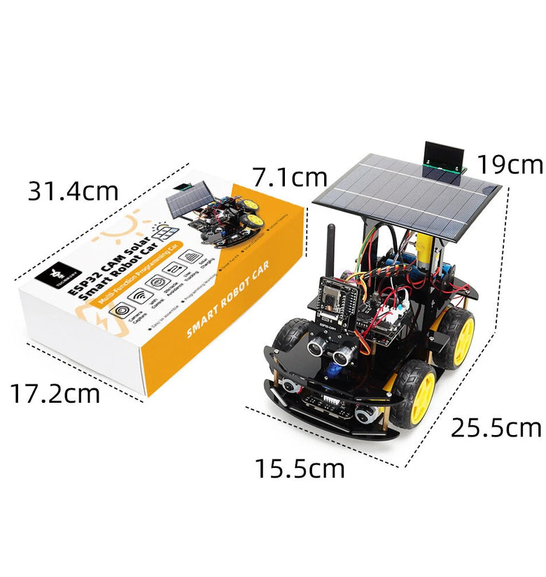 Why choose these kits?1. Effortless Wireless Video Control: With the ESP32 CAM WiFi module, you can effortlessly control and monitor your programmable robotic kit from your cell phone or PC, using real-time video streaming for seamless remote control.2. No-Soldering Circuit Assembly: Enjoy a hassle-free assembly process with our no-soldering circuit design. Whether you're a beginner or an experienced maker, you can put together your robotic kit without the need for soldering skills or equipment.3. Comprehensive Assembly Manual: We provide a detailed assembly manual to accompany your kit. It guides you step by step through the assembly process, ensuring a smooth and frustration-free setup, even for those new to robotics.4. Expandability Beyond Limits: Our product offers high extension capabilities, allowing you to customize and expand your programmable robotic kit for a wide range of applications. The possibilities are limited only by your imagination.5. Solar Charging for Sustainable Power: Our kit comes equipped with a 5V solar charging function, harnessing the energy of the sun to charge your 18650 battery, providing a renewable and eco-friendly power source for your devices or projects.6. Endless Creativity with Programming: Your robotic kit is programmable, opening the doors to endless creative possibilities. Develop custom code and explore various applications, from educational projects to advanced robotics endeavors.