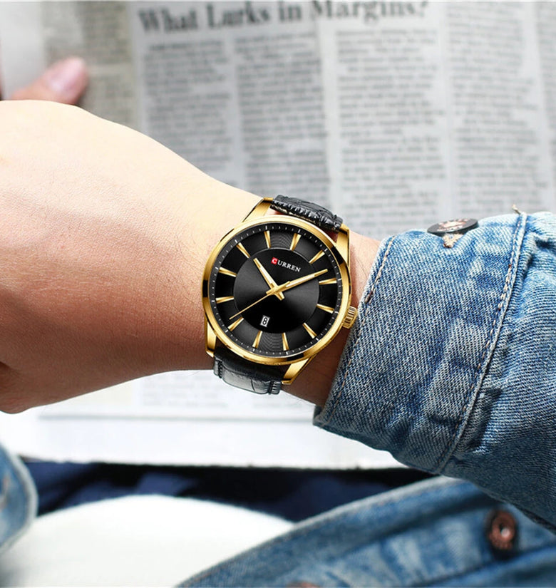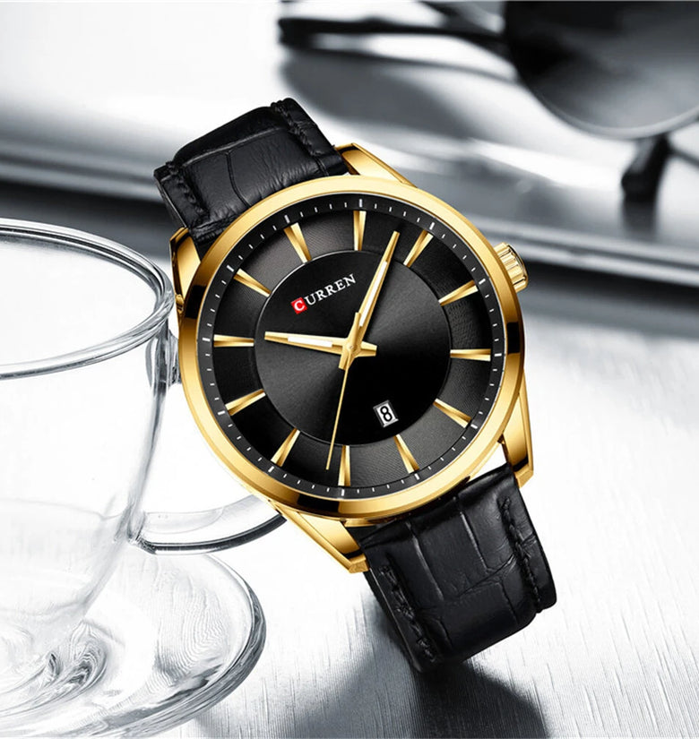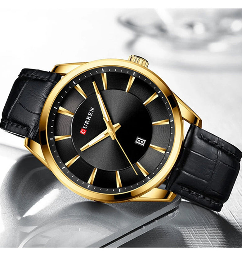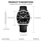 1.45mm Case Diameter: The 45mm case diameter makes a statement, perfect for those who prefer a larger, more eye-catching watch face.2. Leather Strap and Buckle: This CURREN watch comes with a premium leather strap and a safety buckle, which is long-lasting and comfortable to wear.3. Top Men's Watches | Fossil Original Watches | Luxury Brand Business Style: CURREN quartz watches blend luxury with business elegance to enhance your professional image.4. Waterproof Depth: 3Bar, this CURREN watch is waterproof up to 3Bar, allowing you to confidently engage in daily activities.5. Quartz Movement: CURREN watches use precise quartz movements, which are reliable and ensure accurate time every moment.