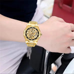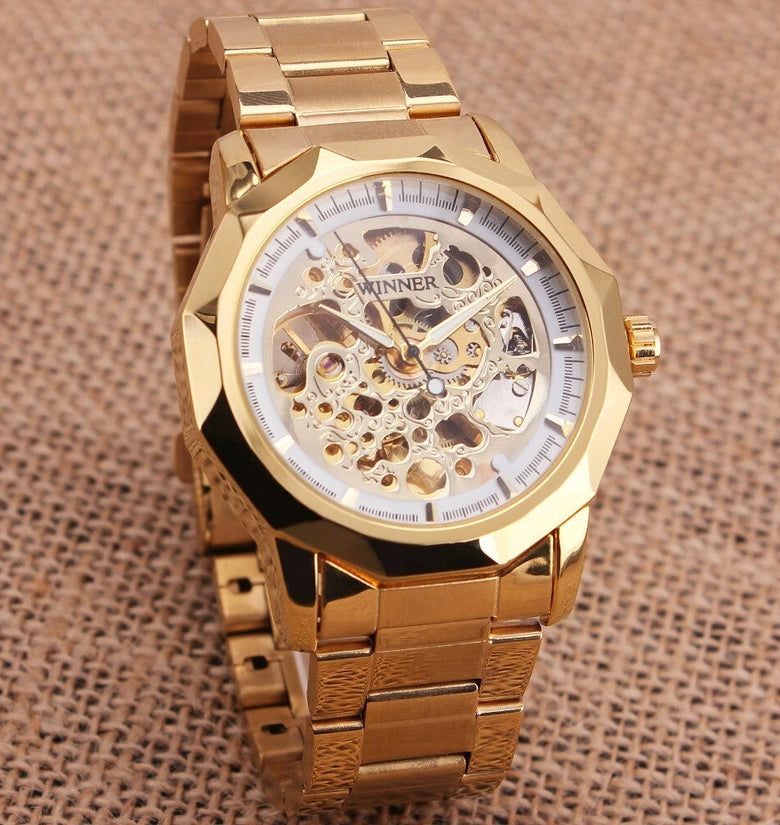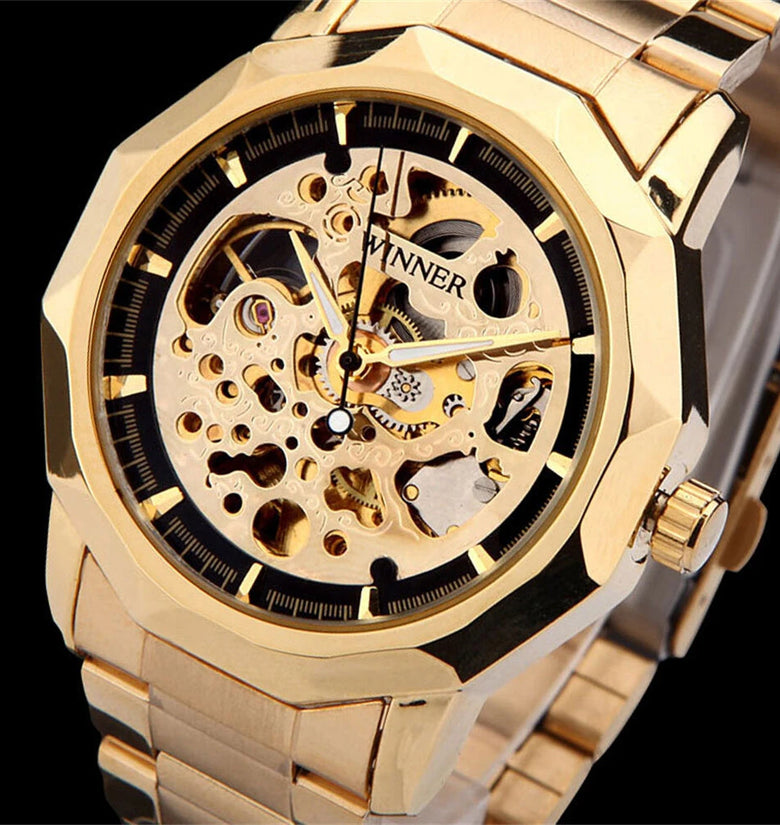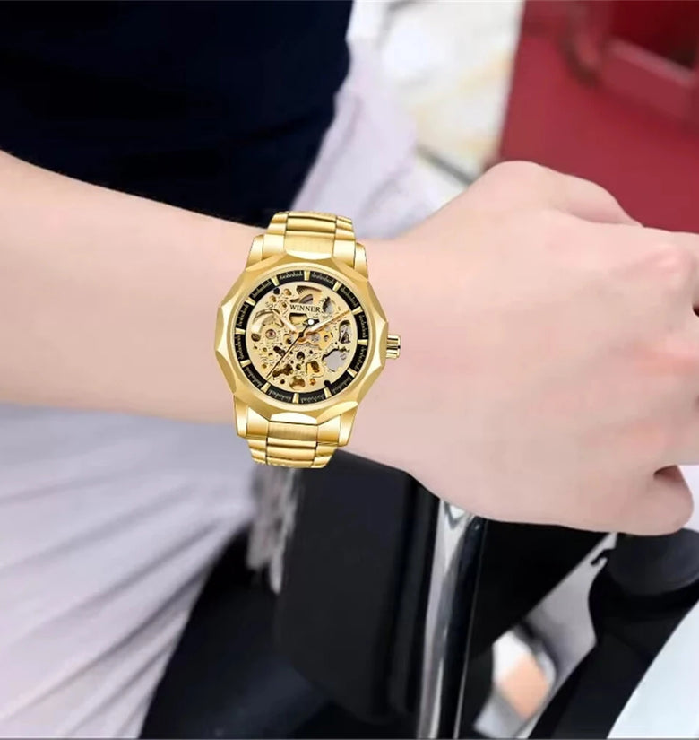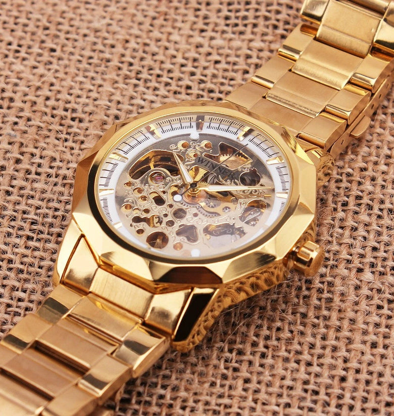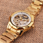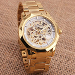 • Fashion Fully Auto Mechanical Skeleton Men Watch Retro Exquisite Dial Gold Steel Band Wristwatch