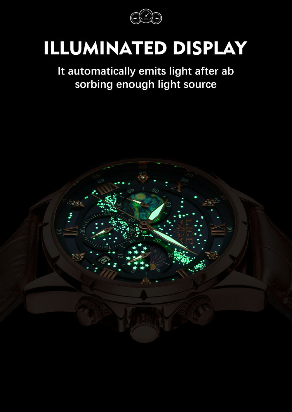 • LIGE Waterproof Luminous Men's Quartz Watch Leather Strap Sports Wristwatch Male Business Casual Watch Auto Calendar