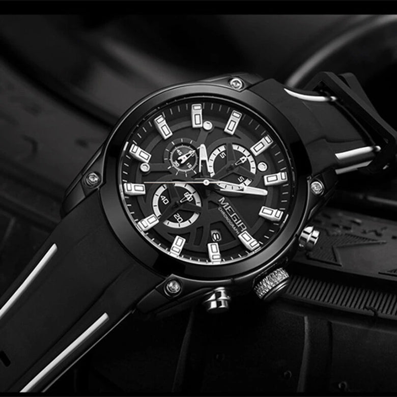 - 3ATM Water Resistant (You can use it when raining and washing hands, DON'T support hot water and swimming);- With Chronograph (Stopwatch) and Luminous Function, with Date display;- MEGIR creative design and high quality materials.