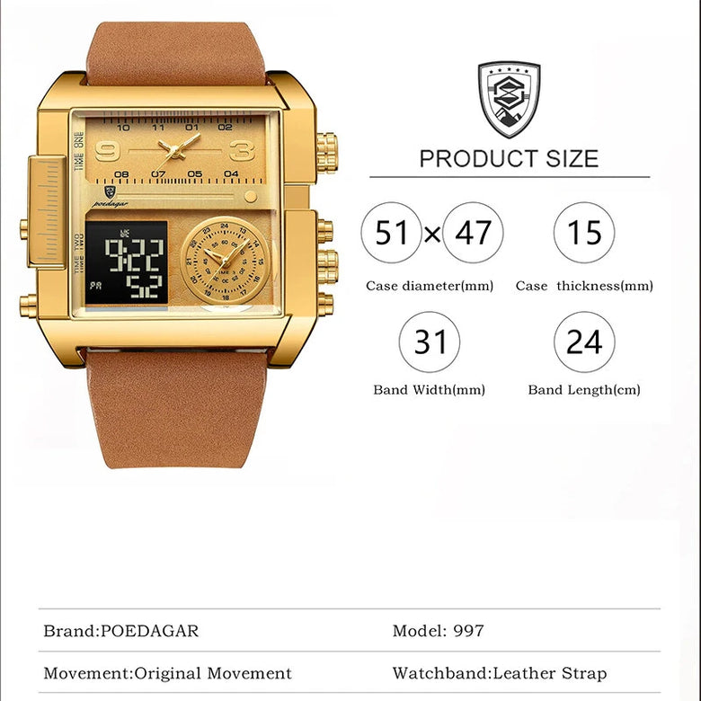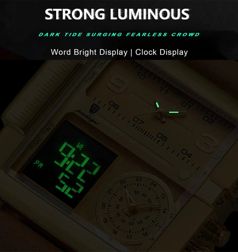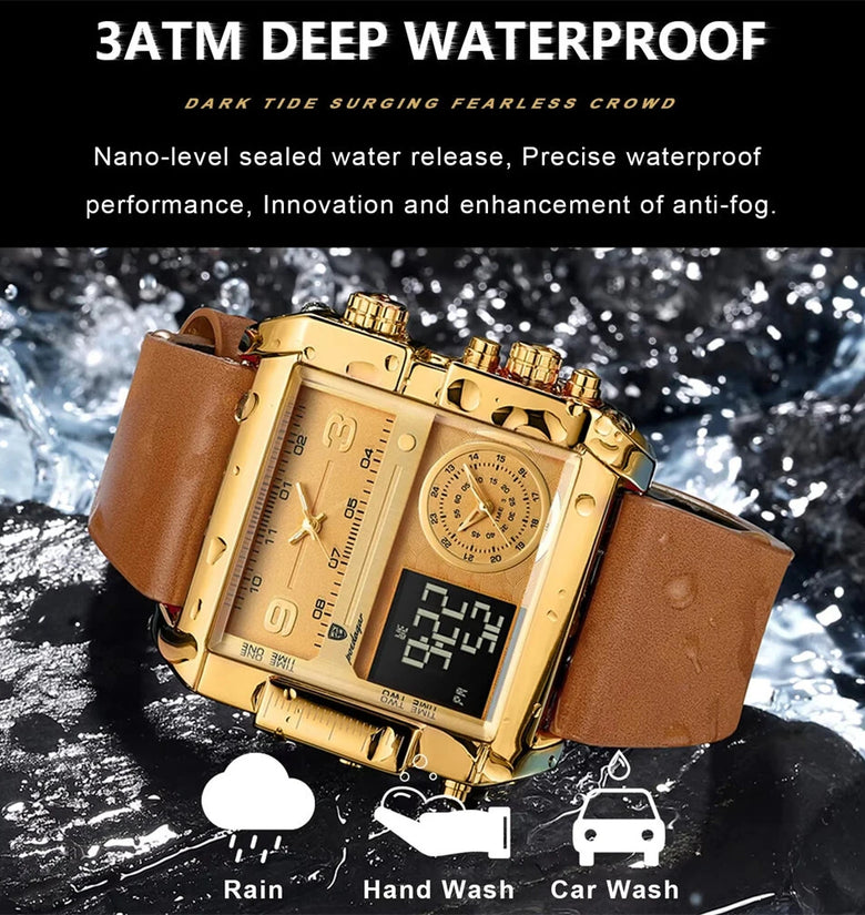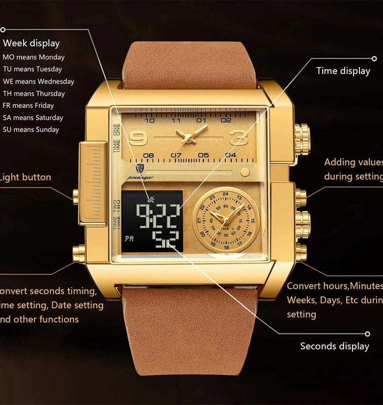 1.Cool design:Unique and cool three cylinder time display with stopwatch, alarm, and date. Large LED dial paired with classic leather strap, atmospheric, showcasing your extraordinary taste.2.Comfortable and Wearable :High quality strap, soft, breathable, and wearable.3.Waterproof:If you are caught in the rain, please do not worry about the safety of your watch. The special materials used to make watches can effectively prevent moisture. The movement is protected by a stainless steel bottom cover and engraved with carvings, which is the emblem of watch.