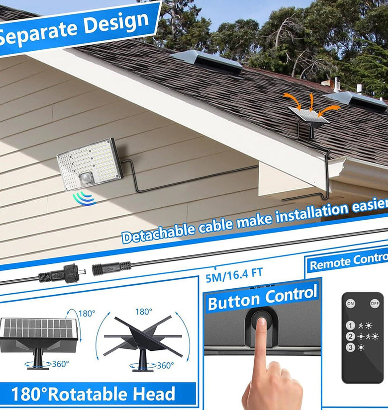 - Easy Installation & Remote Control: The separate design of the solar panel and light fixture, along with the detachable 5-meter cable, simplifies installation anywhere around your property. Additionally, the included remote control allows convenient adjustments and mode selection.