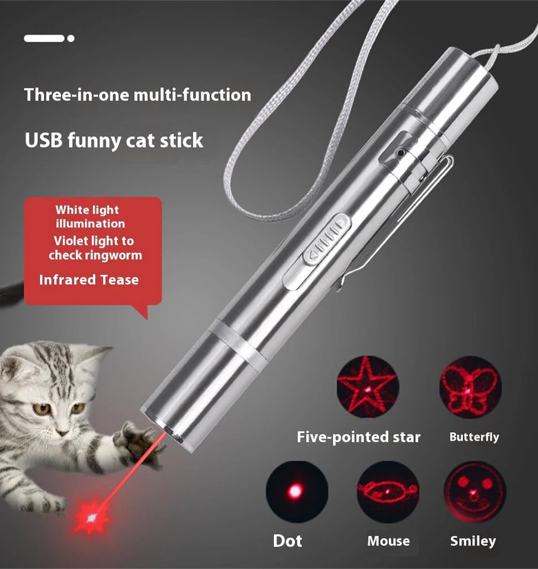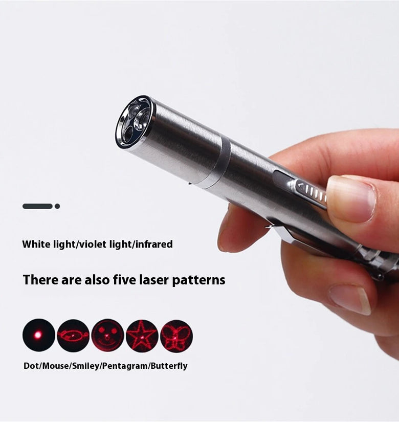 1.This cat toy has 5 patterns: red dot, mice, smile face, star. Turn the black gear on the front end to switch to 3 different modes: red light, purple light, flashlight.