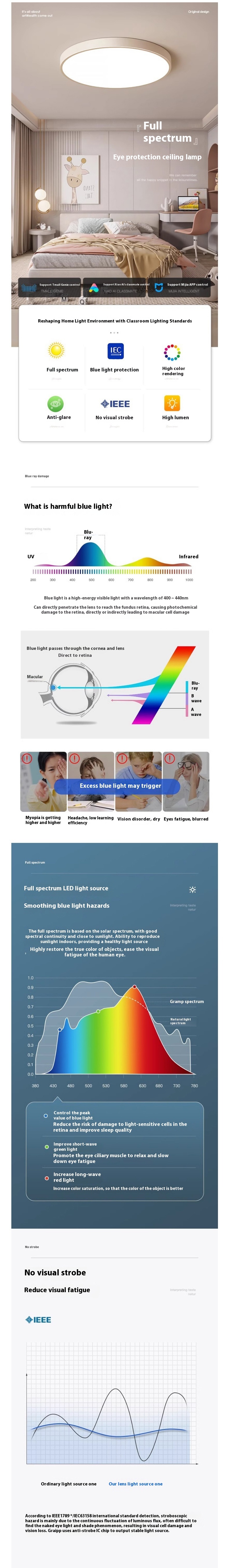 - Blue Light Protection: Designed to minimize harmful blue light (in the 400-430nm range), this ceiling light reduces eye strain and potential eye damage, making it ideal for prolonged use, especially in study or work areas.