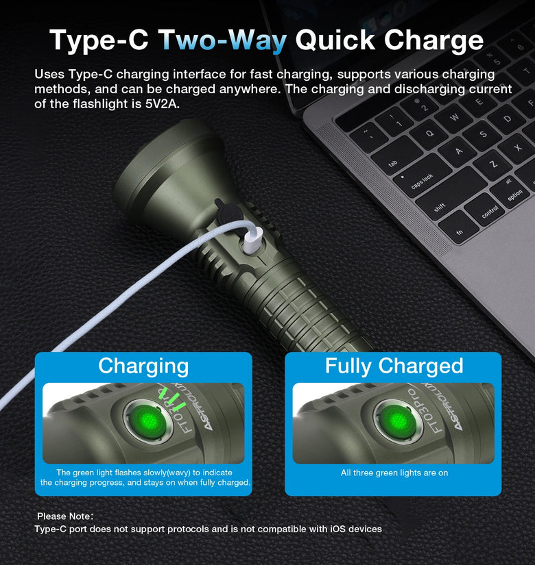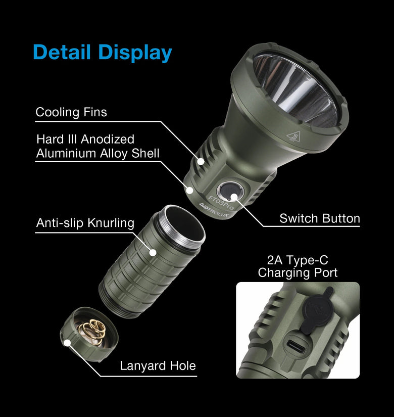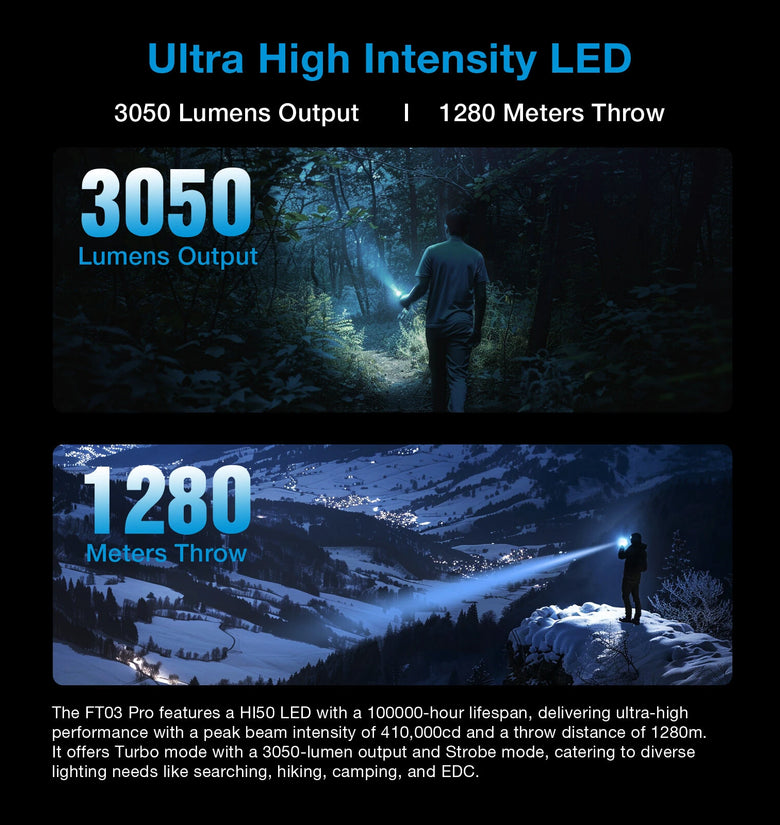 Introducing the Astrolux FT03 Pro, a powerful and versatile flashlight that caters to a wide range of users and applications. With its HI50 LED and impressive 3050-lumen output, the FT03 Pro delivers ultra-high performance, making it an ideal choice for search and rescue missions, outdoor explorations, and everyday carry.The FT03 Pro boasts a peak beam intensity of 410,000cd and a throw distance of up to 1280 meters, ensuring that you can illuminate even the farthest corners with ease. Its Turbo mode provides maximum brightness, while the Strobe mode is perfect for emergency signaling or disorienting potential threats.Designed for convenience and reliability, the FT03 Pro features stepless dimming, allowing you to adjust the brightness smoothly to suit your needs. The single-button control offers easy access to multiple modes, including Low, Turbo, and Strobe, making it simple to operate even with one hand.Made from aerospace aluminum alloy and rated IP65 waterproof, the FT03 Pro is built to withstand harsh environments. The intelligent temperature control system ensures optimal performance without overheating, while the long-lasting battery provides extended use between charges.The FT03 Pro also offers a unique lockout mode for safe storage and a memory mode that remembers your preferred brightness setting. Plus, it's compatible with 26650 batteries for enhanced endurance.Whether you're an outdoor adventurer, a security professional, or just someone who appreciates a high-quality flashlight, the Astrolux FT03 Pro is the perfect companion for your next adventure or daily task. With its powerful performance, versatile features, and rugged design, it's sure to meet and exceed your expectations.